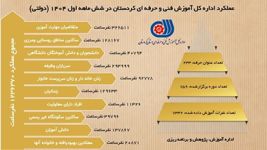 اینفوگرافی کپی لینک کوتاه عملکرد شش ماهه نخست سال ۱۴۰۴ اداره کل آموزش فنی و حرفه ای استان کردستان بخش دولتی گروه خبری : اخبار عمومی کد خبر : 126335 کلمات کلیدی
